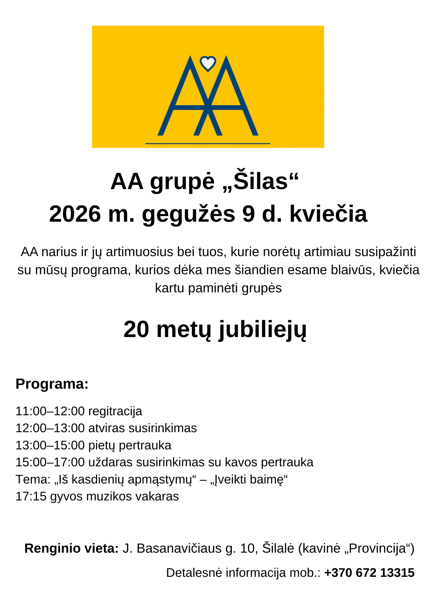 2026 m. gegužės 9 d. Šilalės AA grupė „Šilas” kviečia į 20-ies metų jubiliejų.
